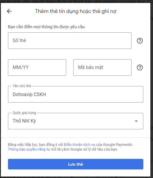 Click vào nút mua xong sau đó điền thẻ visa vào