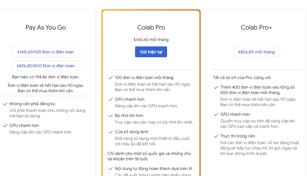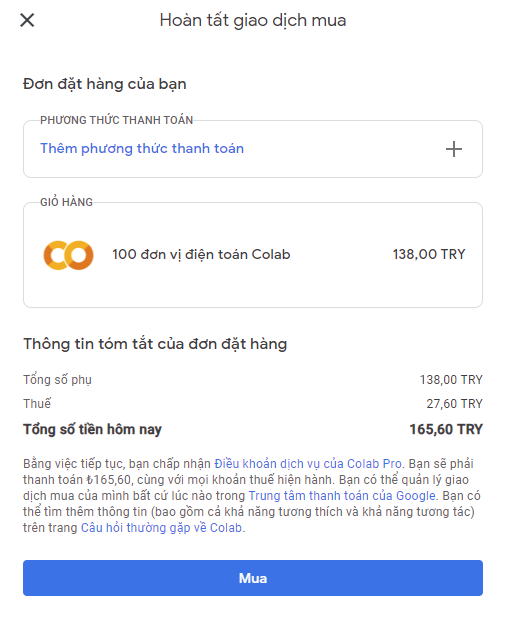 Sau khi xác minh xong thì quay lại trang colab bấm mua là thành công