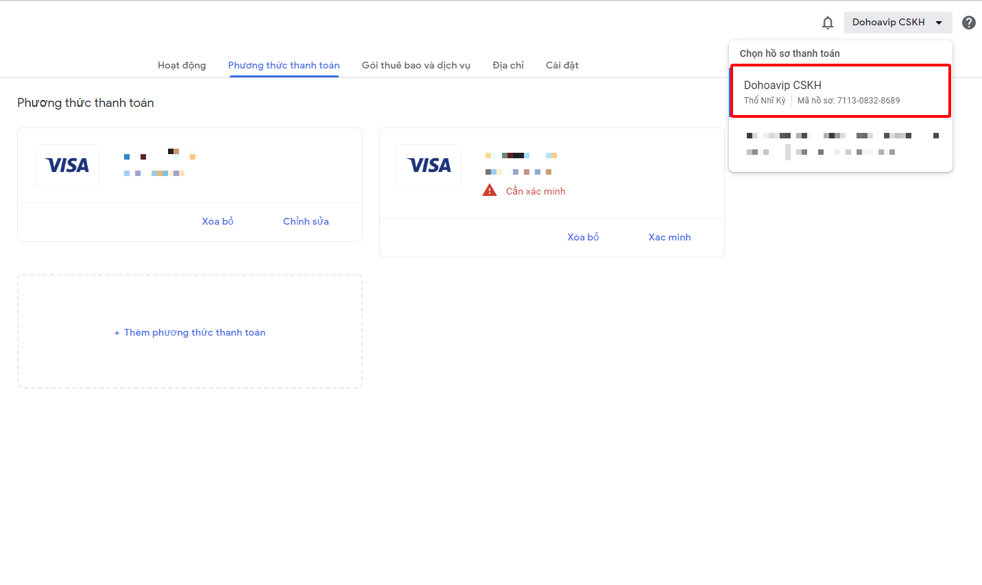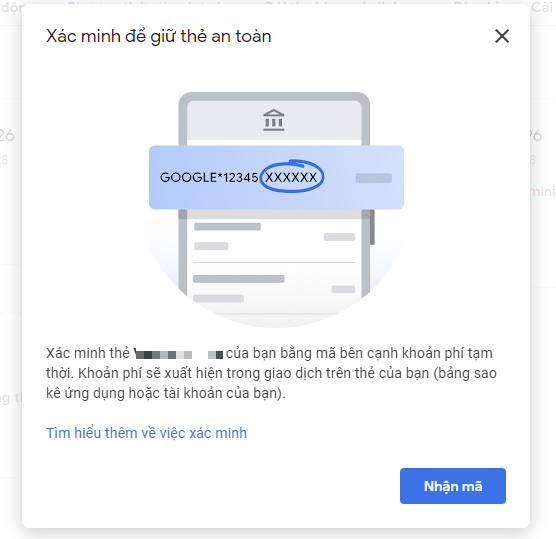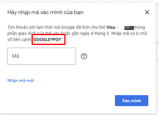 Đoạn này sẽ bị yêu cầu xác minh thẻ. các bạn vào link https://payments.google.com/gp/w/u/0/home/paymentmethods sau đó để ý góc phải có phần chọn profile chọn đúng hồ sơ mà có thẻ đang có chữ cần xác minh